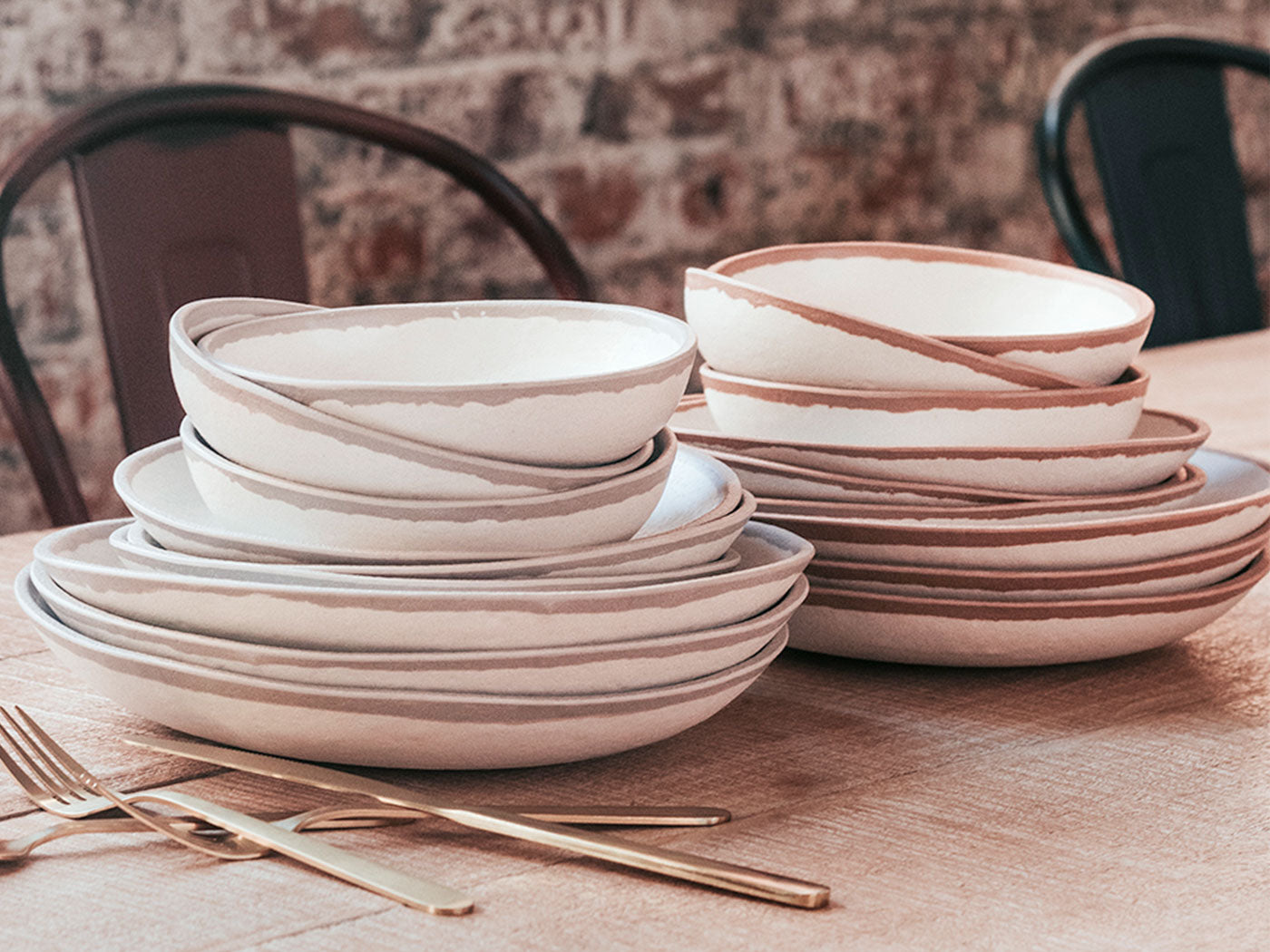 Hand-polished white and patterned pieces that layer beautifully for dinner parties and holidays—elevated for guests, durable enough for everyday.