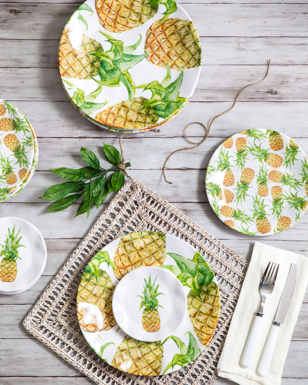 Throw a Tiki Luau dinner party with this cheerful Pineapple collection. Made of 100% melamine, this BPA free dinnerware is virtually unbreakable and easily mistaken for ceramic or porcelain.