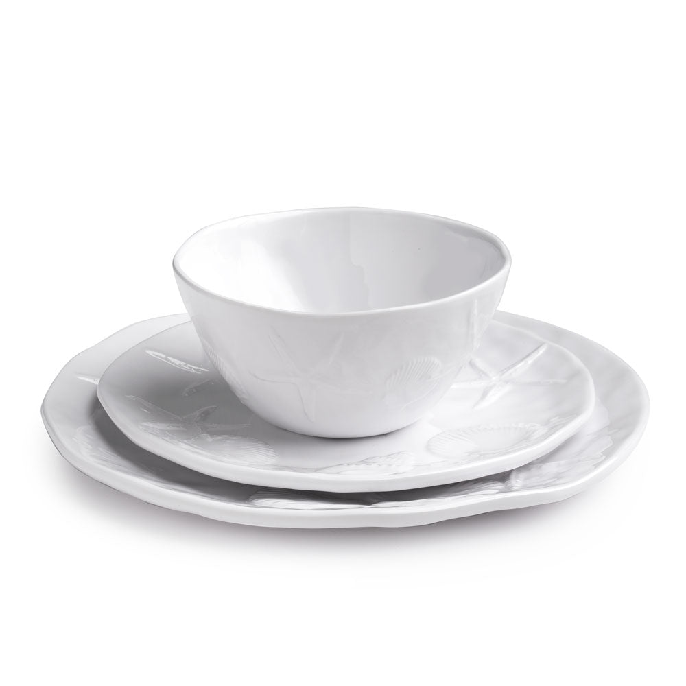 The Captiva Sea Life White Melamine Dinnerware features a a classic sea life design, elevated by our signature luxe white melamine and pairs perfectly with our Captiva Collection.