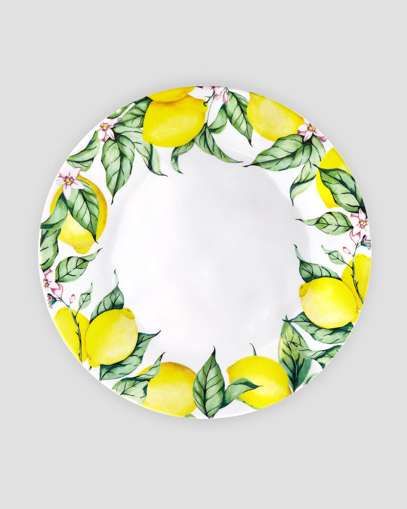Our Limonata dinner plate features fresh cascades of lemons and blossoms. This dinner plate from our Limonata series is a citrus filled delight.