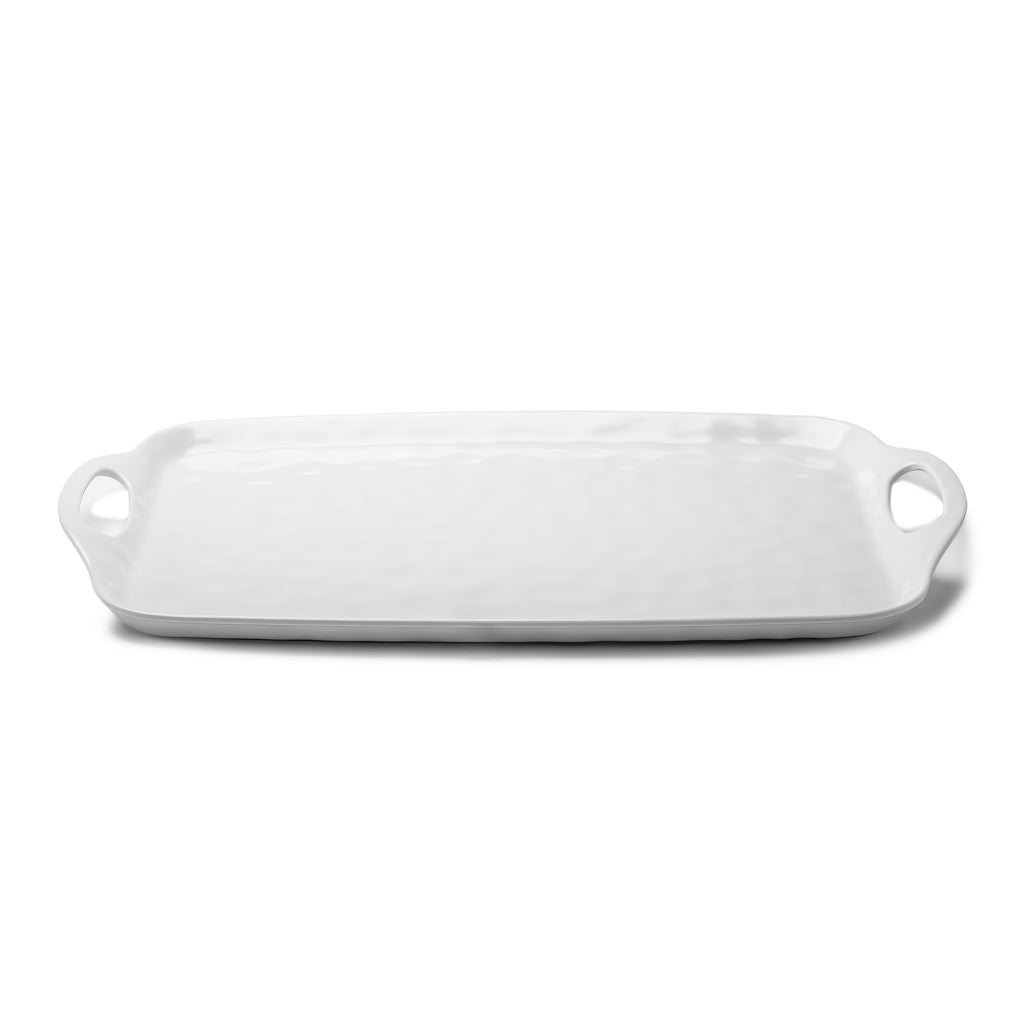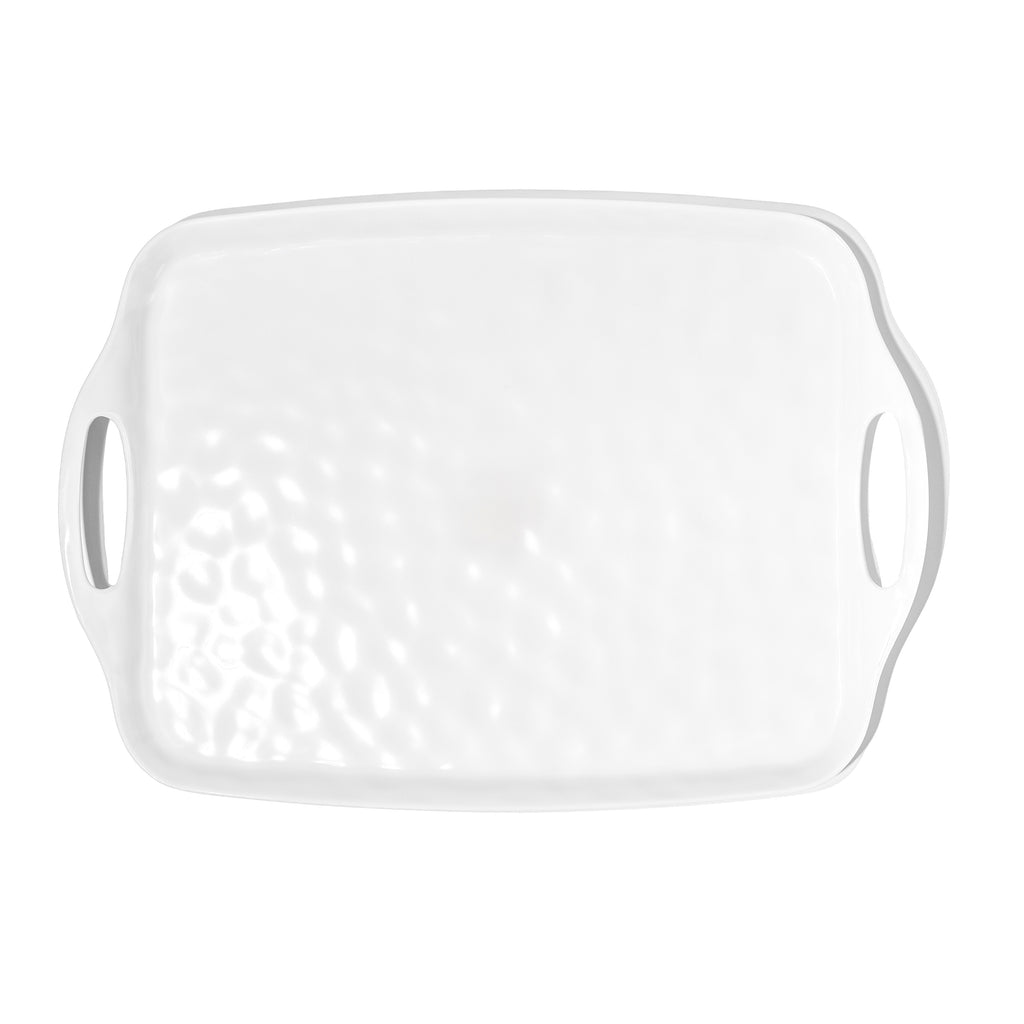 A timeless essential for effortless entertaining, the Hampton Collection Serving Tray features a hammered texture, elegant beaded edge, and built-in handles for easy carrying. Its spacious rectangular design is perfect for serving drinks, appetizers, or desserts with style. Made from durable, high-quality melamine, this tray offers the sophistication of fine serveware with the practicality of a lightweight, shatterproof design—perfect for indoor and outdoor gatherings alike.