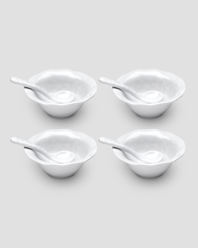 Our Ruffle round 8pc tasting set in white features our signature ruffle textured design. The ultimate in simple elegance, the Ruffle collection is perfect for year-round, indoor and outdoor dining and promises to help make entertaining easy and fun.